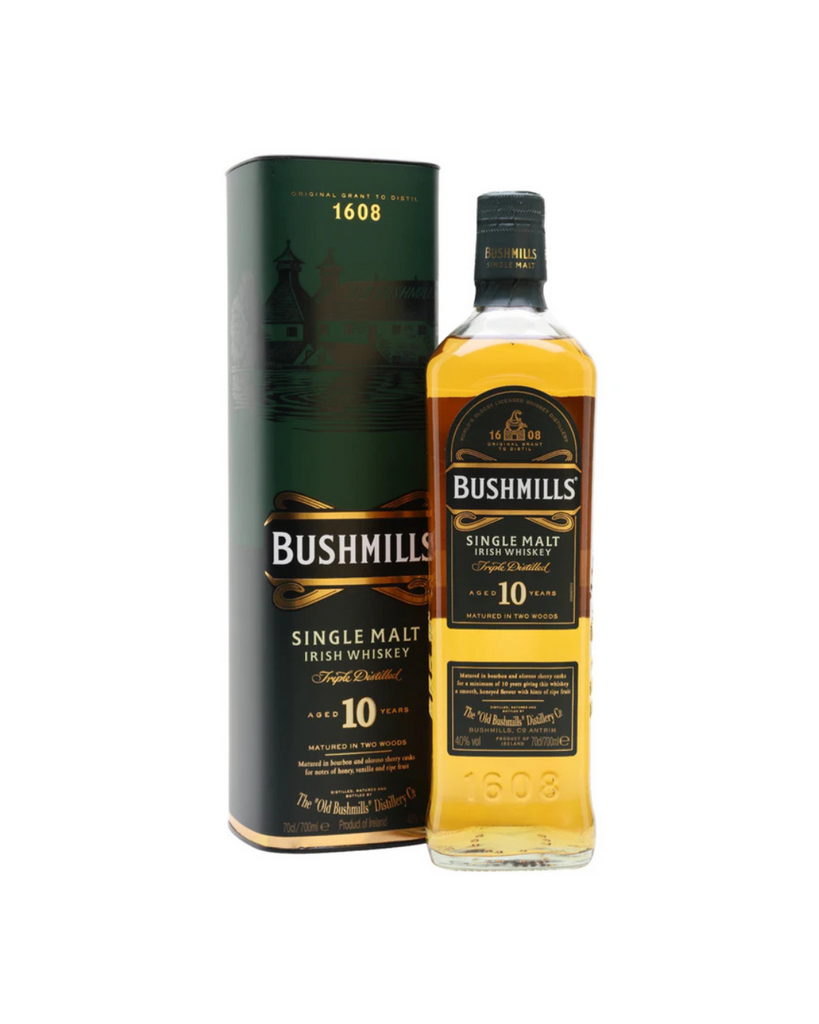 Our Bushmills 10 Year Old is a marriage of single malts matured for at least 10 years in hand-selected bourbon barrels and sherry butts. Zesty and fresh on the nose, followed by notes of ripe fruit, creamy vanilla and soft toasted wood.